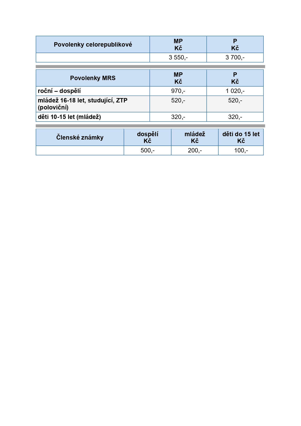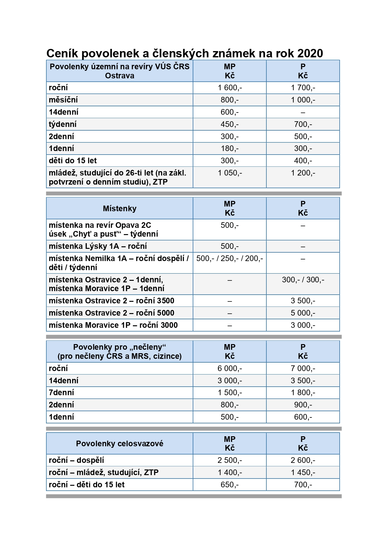 Níže uvádíme ceník povolenek a členských známek pro rok 2020