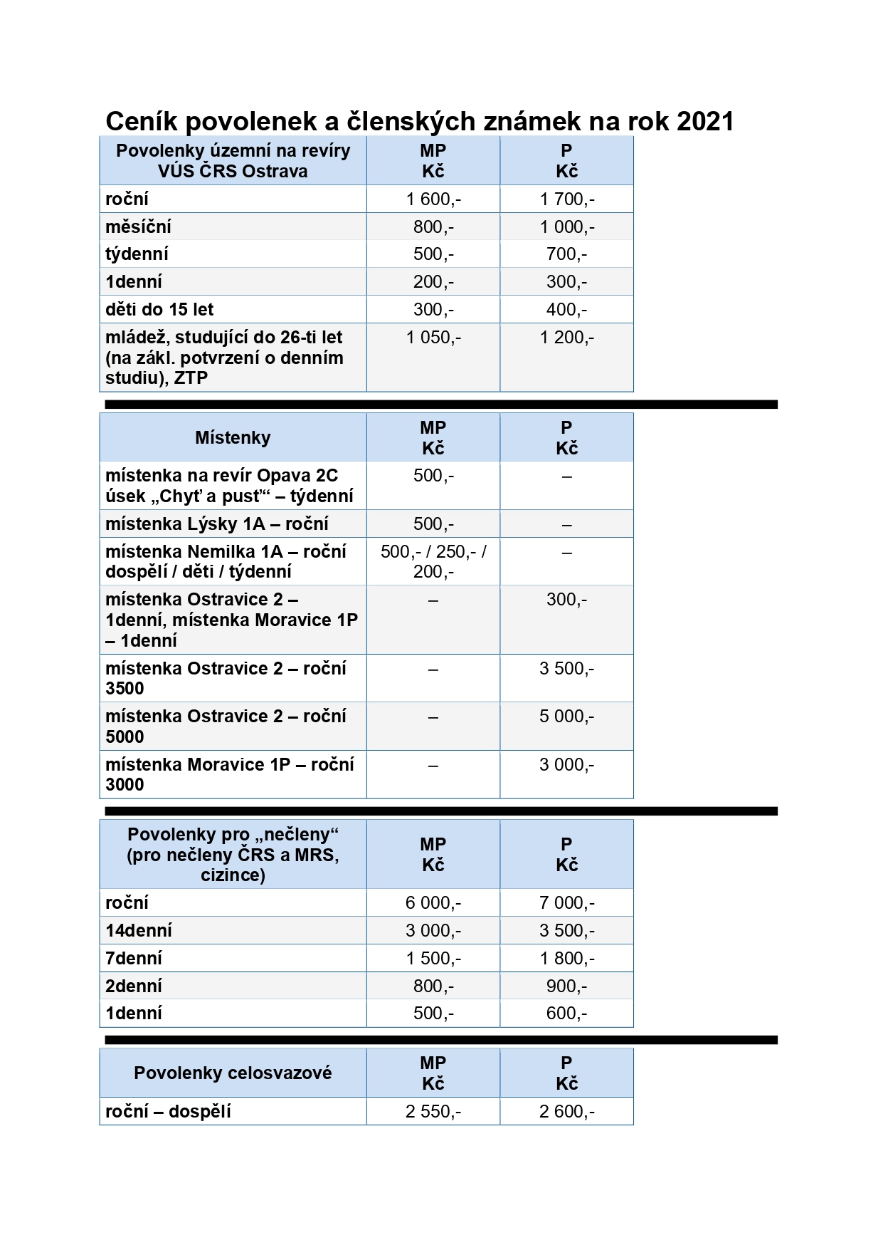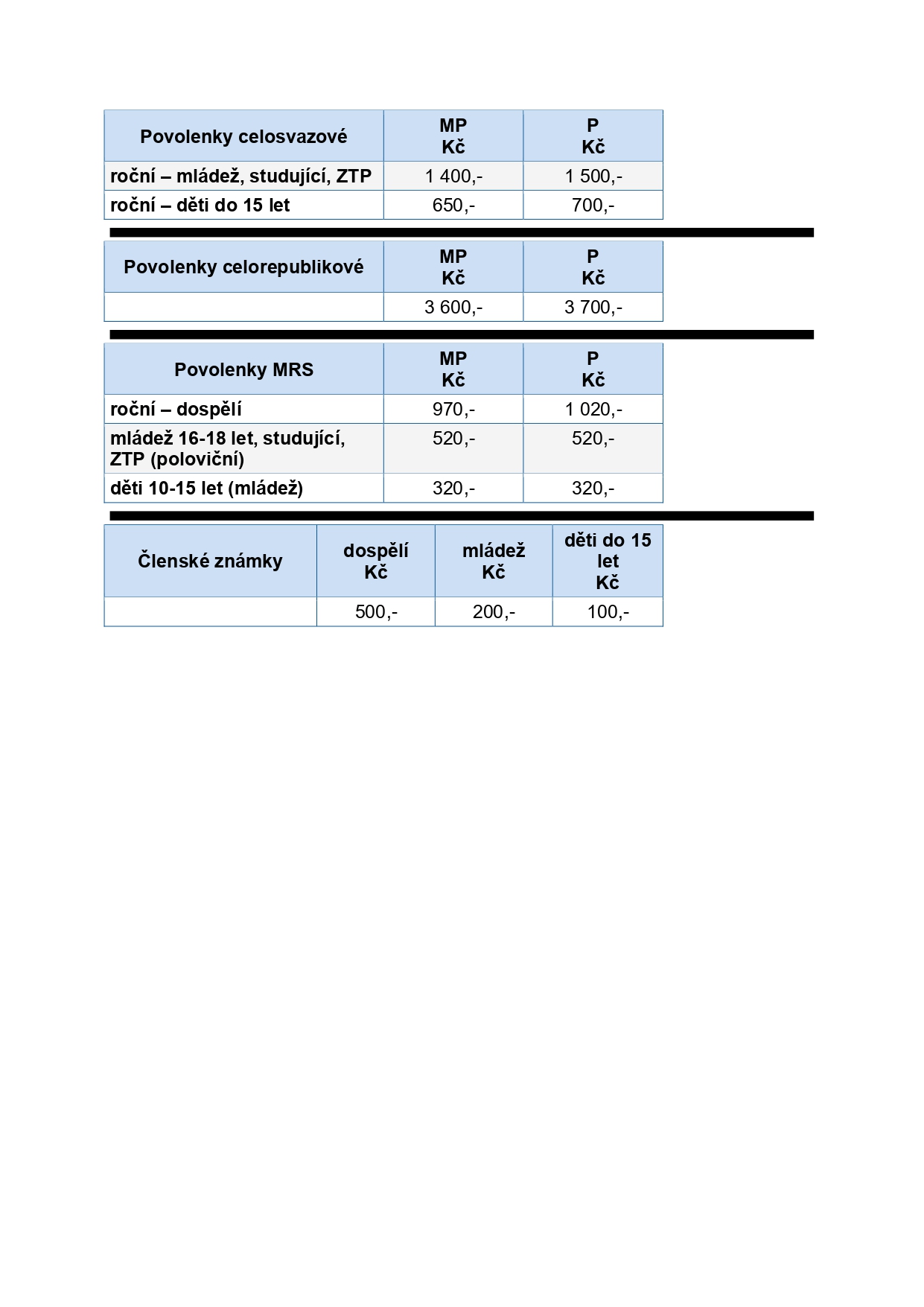Níže uvádíme ceník povolenek a členských známek pro rok 2021