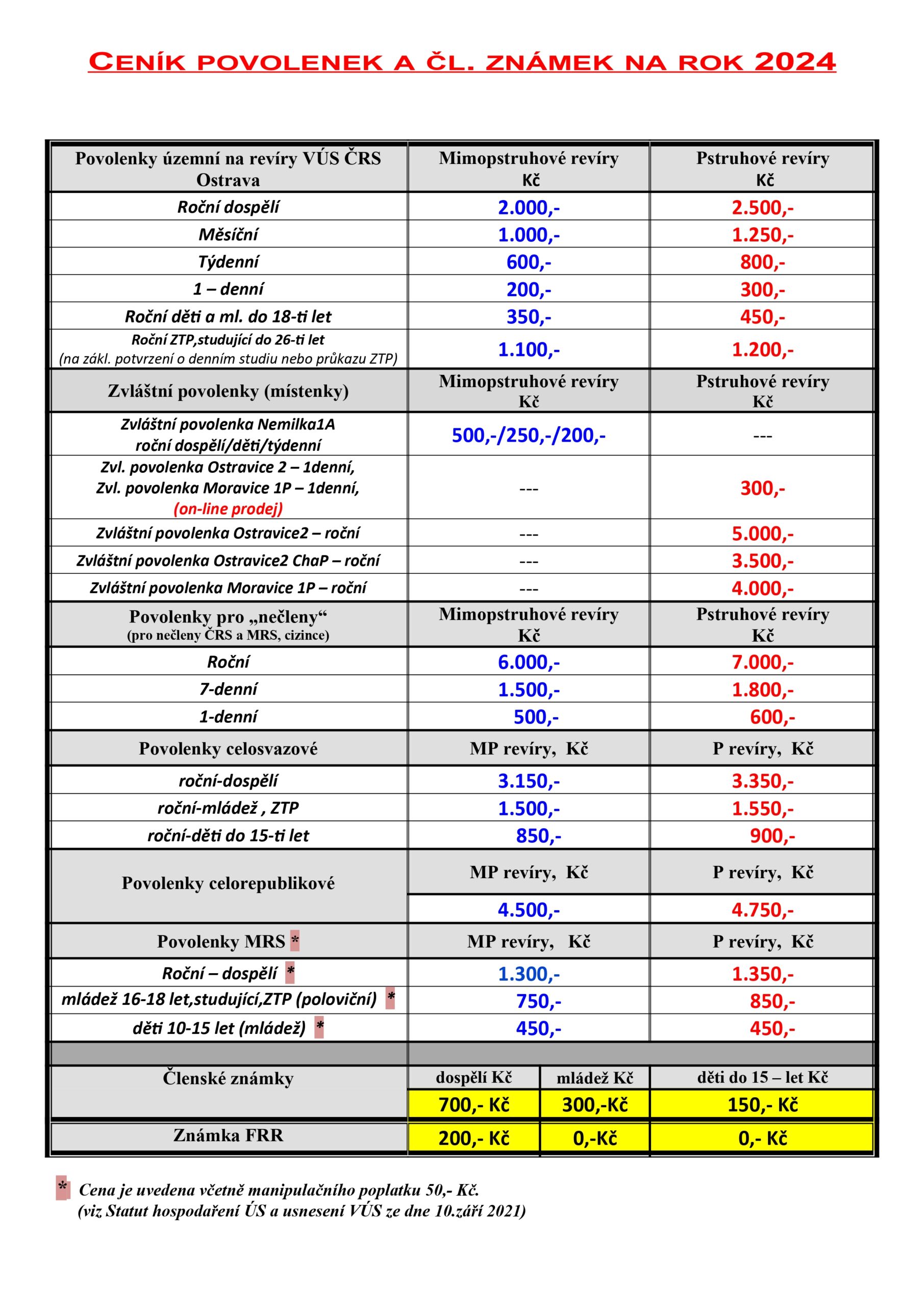 Níže uvádíme ceník povolenek a členských známek pro rok 2024